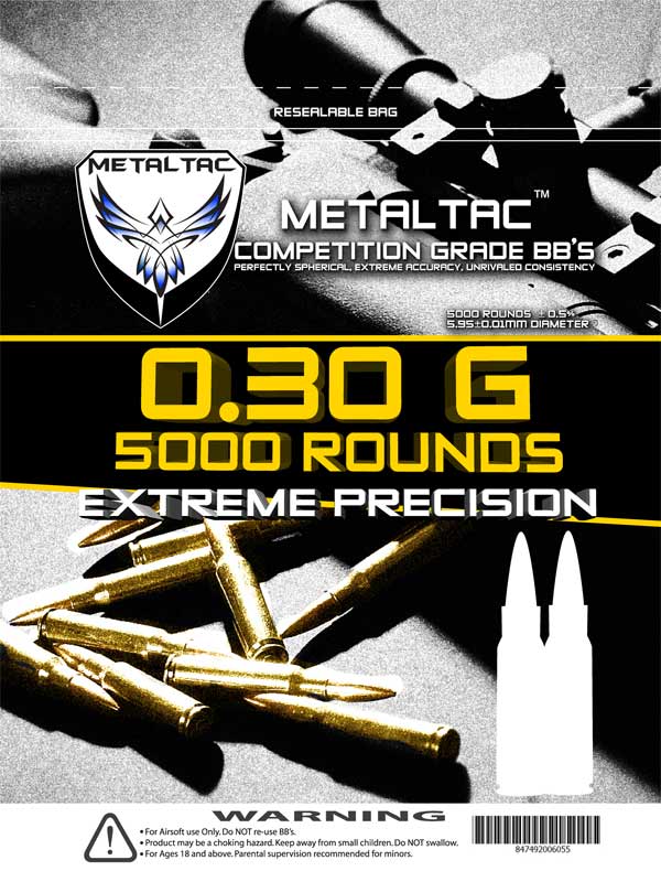 Heavy Weight, perfect for high quality AEG, perfectly balanced BB, extreme accuracy. High Precision, ultra smooth and perfectly balanced BB. Precisely made with minimal variation (+-0.01mm), weight precisely at 0.3g (+-0.01g) The Metal precision rating level has exceeded most the brand out there available on the Market, running head to head to the best Japanese brand BBs’. 5000 Round The most valued package 0.3g BB available.